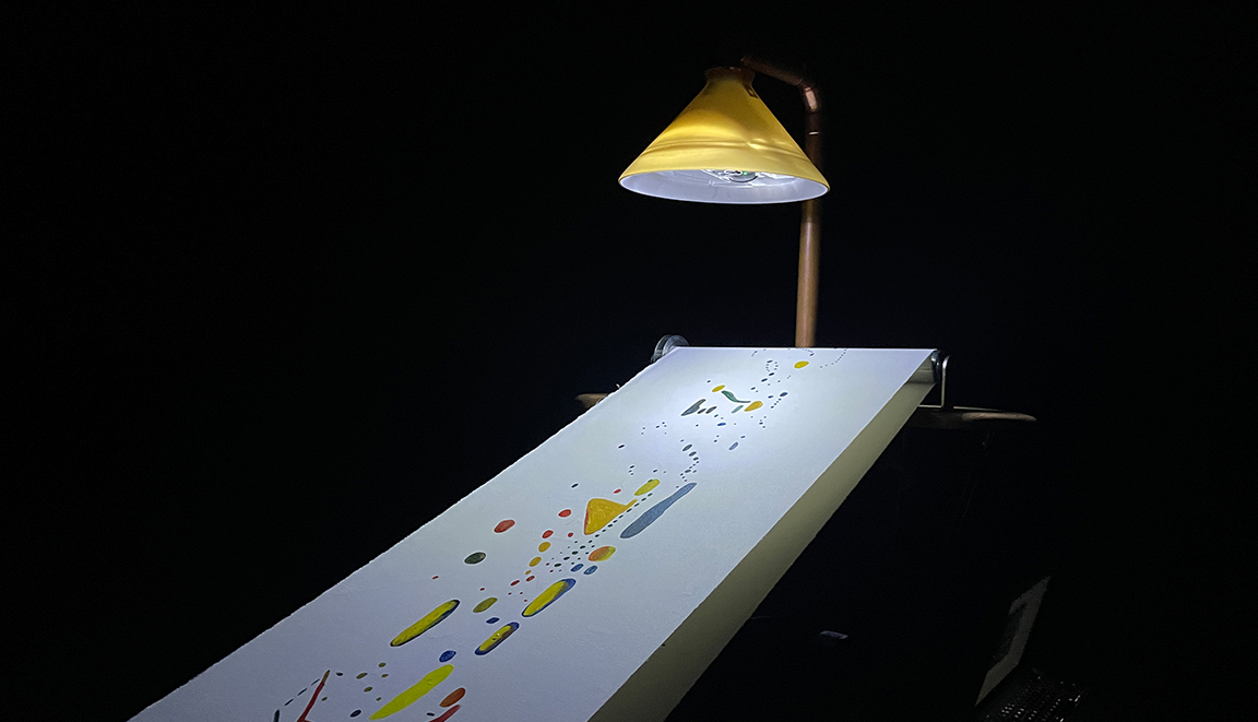 The Dollarstore Ouroboros is a 36 foot long loop that rotates once every 34 minutes. The accompanying braces are built with objects from the artists childhood home. Each stroke on the canvas guides the frequency of an electronic synthesizer, as the canvas passes under the lamp a melody is played. With each rotation the method of interpretation is changed effectively making the composition infinite. This installation is the first in a series of loops which will co-habitate in larger feedback ecosystems.